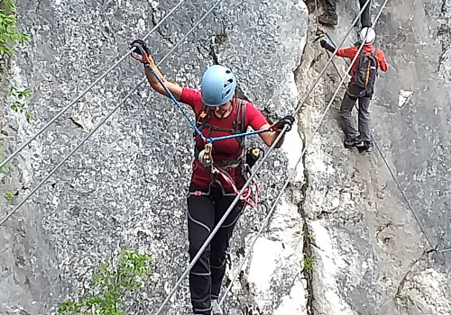 Anspruchsvoller Sportklettersteig mit 30 m langer 3-Seilbrücke mit sehr beeindruckender Schluchtüberquerung (Tiefblick!).